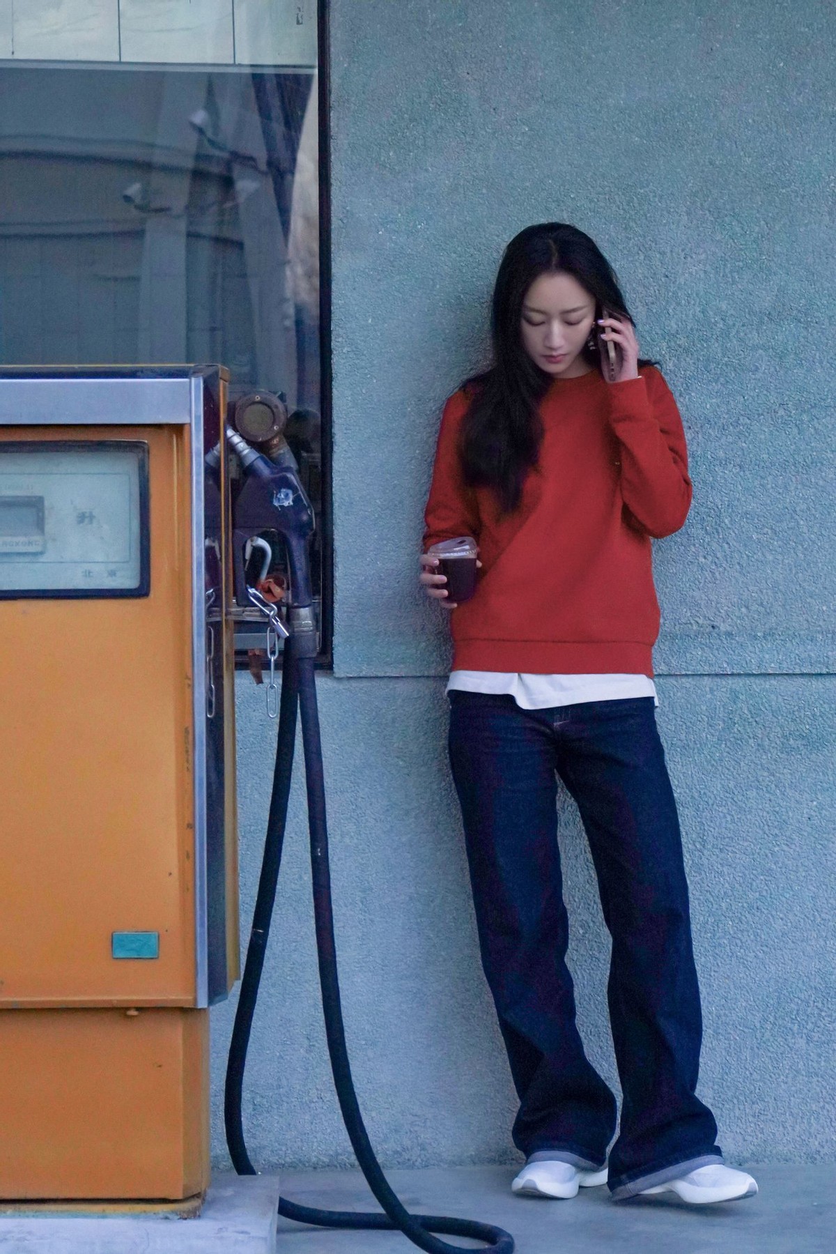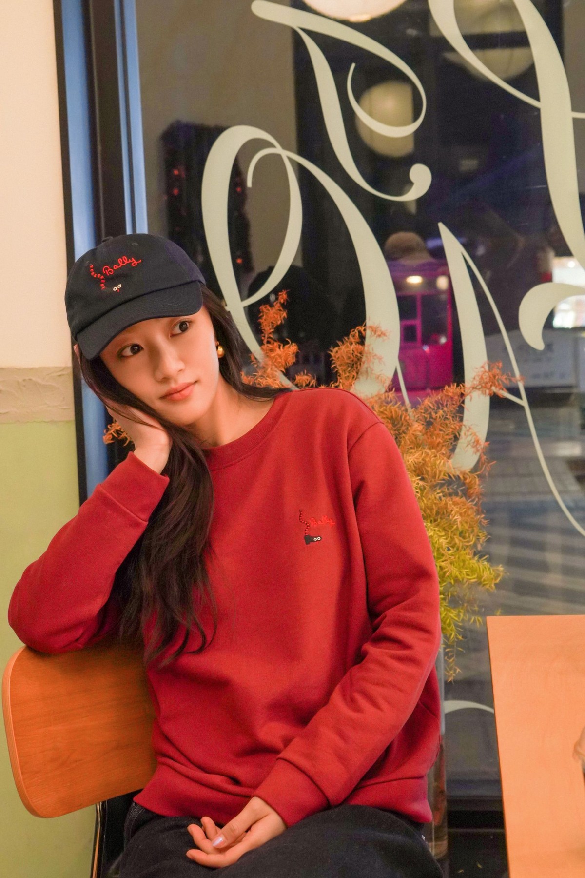 演员黄子琪穿着 Bally 2025蛇年限定款红色圆领卫衣和 Dune 女士运动鞋,戴着蓝色棒球帽,休闲风格红运满载,营造动感氛围。