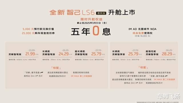 满配再升舱,已是同级最强智能SUV。发布会上,智己汽车诚意加码,还公布了极具吸引力的用户权益。3月31日前锁单,可享5,000元预付款兑换价值25,000元购车现金抵扣券,即直享21.99万~28.29万元限时权益价;及价值36,800元的IM AD无图城市NOA终身免费使用;同时,还有“5年0息大额贷”金融方案,购车零压力。