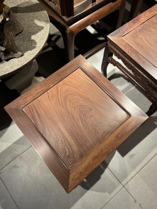 首先在用料上,这款方凳用的是独板,知道花枝材质的爱好者都知道,花枝比较少大料,很多工厂如果制作的一些普通的花枝产品,用的都是拼料去制作的。能用独板去制作,已经是有带稀缺的性质。