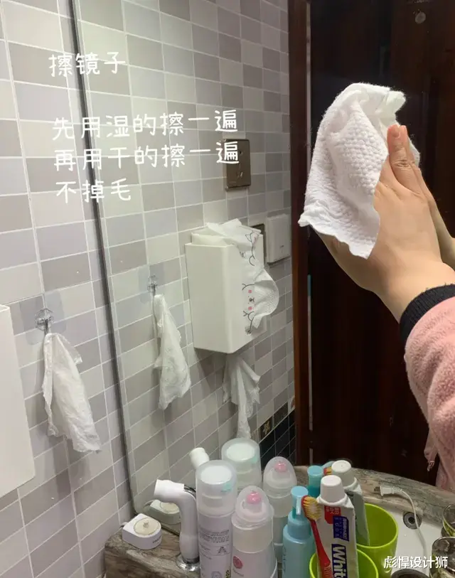 她会将用过的洗脸巾晾干,然后用来擦拭家里的各个角落,从台面到桌子,从卫生间墙顶到马桶,甚至是油烟机,都能见到它的身影。