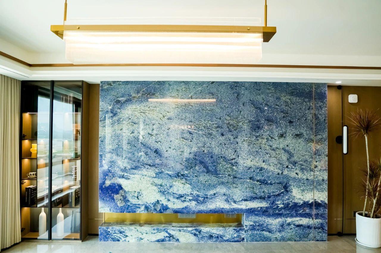 样板间多处臻选「巴西梦幻蓝」天然奢石匠造,犹如大海的层层浪花,给人以梦幻般的视觉享受,沉稳奢华的雅贵气质不彰自显。