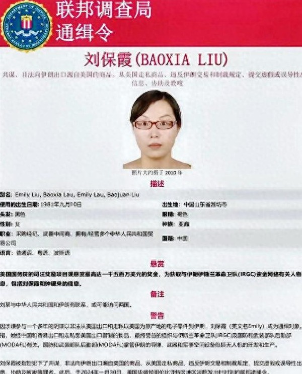 从FBI的通缉令上可以看出,刘保霞出生于山东潍坊,她所在的公司主要负责电子采购。
