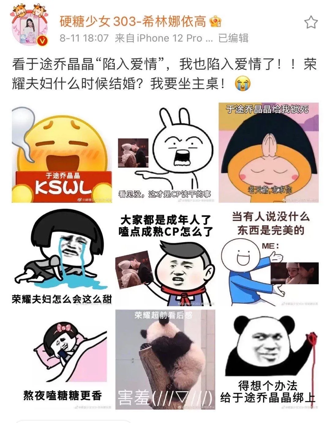 磕CP容易使人陷入爱情,明星也不例外。希林娜依高就带头磕“荣耀夫妇”,看于途乔晶晶“陷入爱情”,自己也陷入爱情,还在线催婚,表示自己要坐主桌。