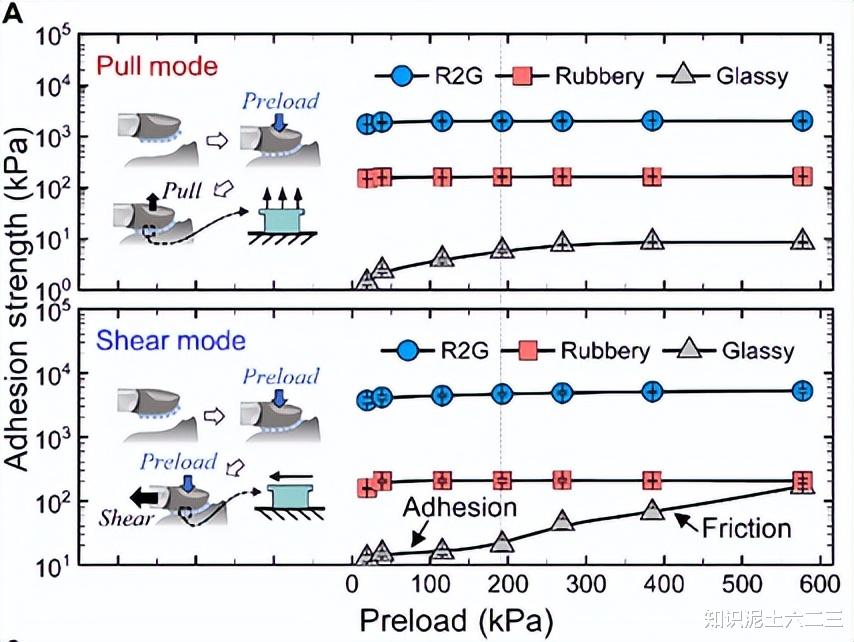 先看预载对粘附强度的影响,在两种模式下,R2G和橡胶态粘附力在约38.5kPa预载时就会饱和。R2G粘附力在拉伸模式下约为2.0MPa,剪切模式下约为5.1MPa;橡胶态粘附力在拉伸模式下为164.4kPa,剪切模式下为206.9kPa。这个粘附力和预载的比值相当高,远远超过了现有的干粘合剂和其他仿生设计,这就使得机器人手能够可靠地抓取各种物品,从脆弱的鸡蛋、蛋壳到沉重的钢球都不在话下。