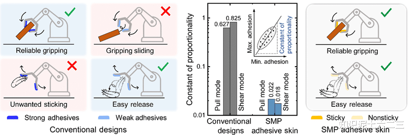 传统的智能粘合剂大多由软弹性体制成,这就带来了一个大问题。比如说,在搬运重物时,需要很强的粘附力,但这种强粘附力在处理轻小物品时就成了麻烦。像抓取布料、纸张或者微芯片时,很容易因为粘附力过大而损坏物品。而且在传感应用中,过多的粘附还会干扰信号检测。我们来看这张图,传统粘合剂的最大和最小粘附强度是相互关联的,比例常数在拉伸和剪切模式下都比较高,这就限制了它的应用范围。