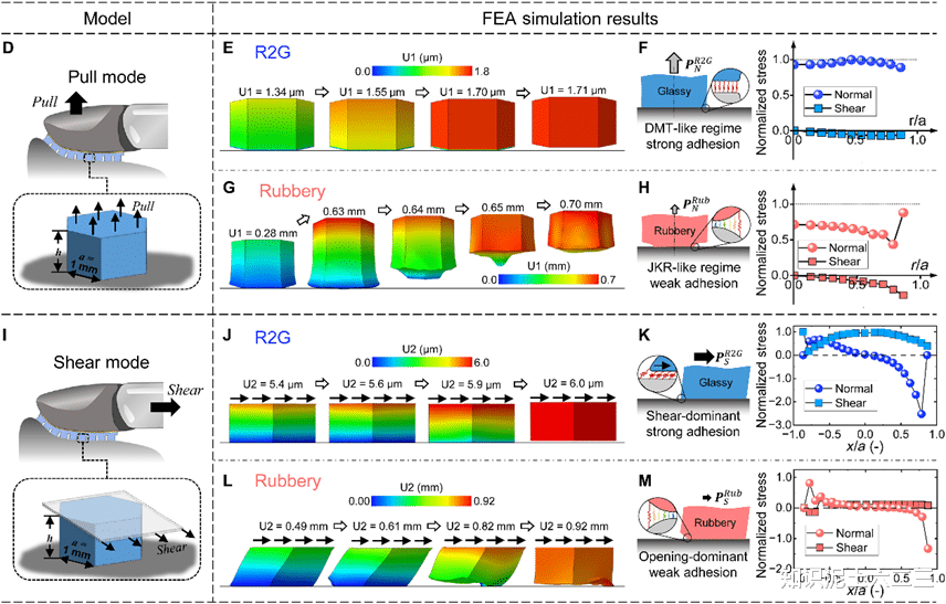 这种粘合剂皮肤还有一个超厉害的地方,就是它能轻松从强粘附(大约兆帕级)切换到弱粘附。它的粘附切换比(最大粘附强度与最小粘附强度之比)在R2G条件下超过102。通过有限元分析模拟SMP纤维在拉伸和剪切模式下的脱离机制,在拉伸模式下,R2G粘附类似DMT行为,纤维会均匀脱离,界面应力均匀分布;而在橡胶态时,纤维通过裂纹扩展脱离,导致粘附力较弱。在剪切模式下,R2G条件下剪切应力主导,粘附力强;橡胶态时呈现开口主导的脱离行为,使得剪切粘附力变弱。