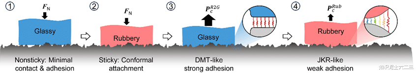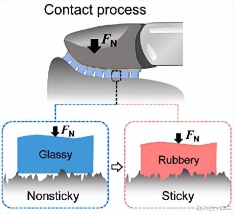 SMP纤维的模量在不同相态下的变化是实现其神奇粘附功能的关键。它的模量跨度可达三个数量级,这就使得它能在不同相态下按需粘附和脱离。在玻璃态时,SMP坚硬(E’2GPa)且不粘附,这种特性在一些需要低粘附或无粘附的应用场景中非常实用。当加热到橡胶态时,SMP软化(E’1MPa)并形成粘性接触。