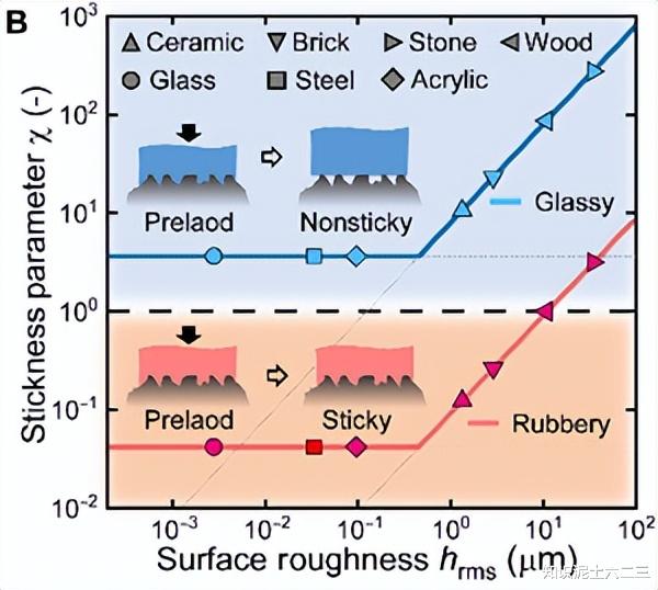 通过研究SMP纤维与常见基底在近零负载下的粘附相互作用,发现了一个有趣的现象。根据粘性参数χ可以判断粘附状态,当χ > 1时,纤维不粘附,根本形不成有效的接触面积,粘附力几乎可以忽略不计;而当χ < 1时,纤维就会变得粘附,即使在很小的预载下也能形成有限的接触面积,在拉脱时就能测量到明显的粘附力。从这张粘性图可以看出,在玻璃态下,SMP纤维对所有基底都是不粘附的(χ > 1);在橡胶态下,除了高度粗糙(hrms = 34.39 μm)的木质表面外,对大多数表面粗糙度(hrms)达10.91μm的基底都是粘附的(χ < 1)。