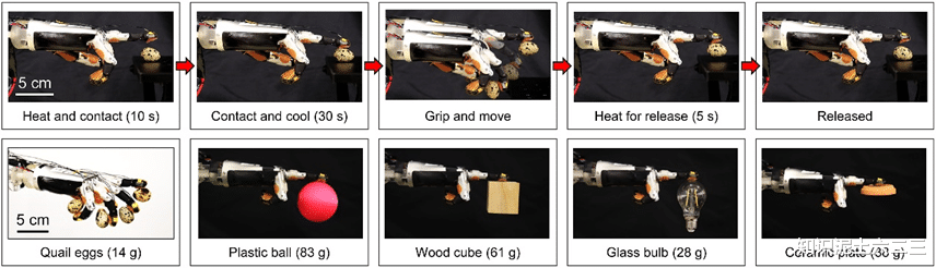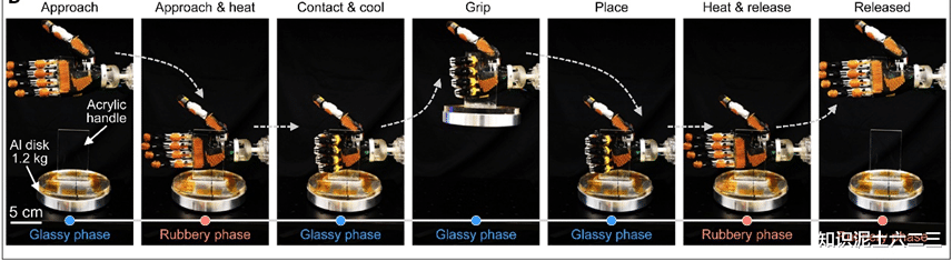 但在R2G条件下,机器人手就能稳稳地抓住铝块并轻松提起,当加热回到橡胶态时,又能顺利释放。