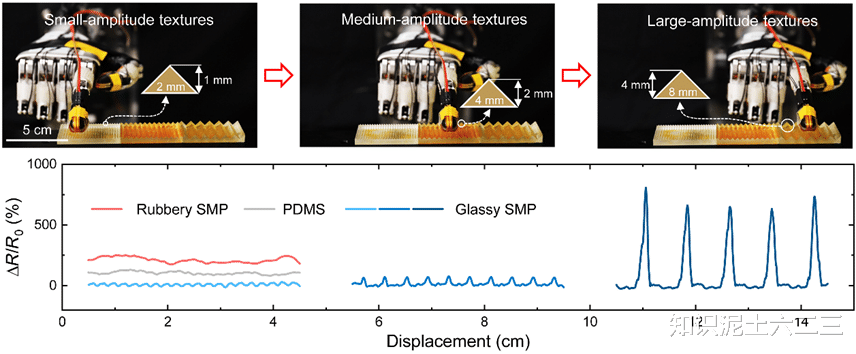 在检测表面形态时,处于非粘性的玻璃态的粘合剂皮肤能让机器人手指顺利滑过具有不同振幅波浪纹理的表面。利用压力传感器可以准确检测表面形态,记录的信号波长和振幅与表面纹理完全一致。但如果是在橡胶态下,或者使用传统的PDMS纤维,粘附就会严重干扰表面纹理的准确检测,记录的信号会出现很多噪声。