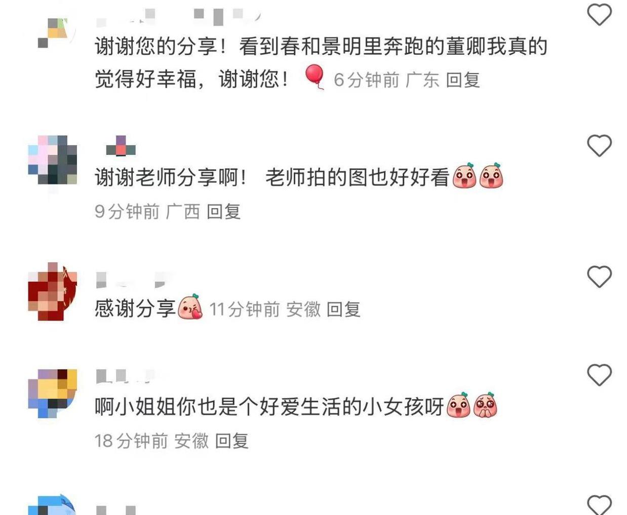 果然,博文一发,评论区就被无数网友和粉丝涌进来,纷纷感谢她的分享。有人提到:“看到春光明媚中奔跑的董卿,心里满满的幸福,真心谢谢您!”这真是发自内心的感谢啊。