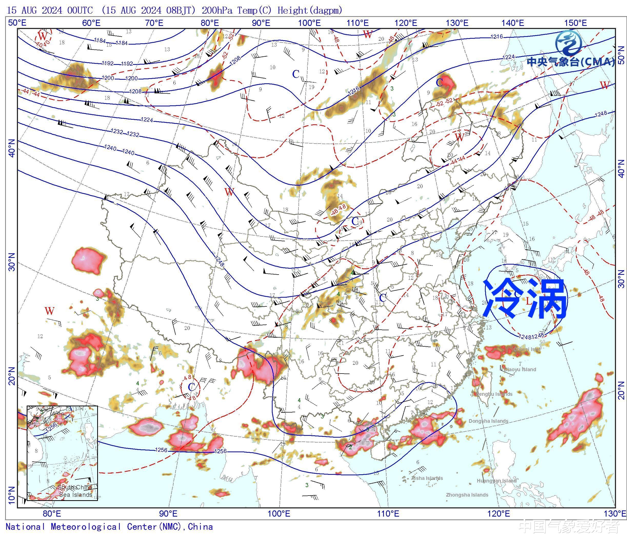 8月14日的分析数据显示,在850百帕的低层大气中,该地区并没有明显的风场结构,这意味着此处的冷涡主要受高空因素的影响。通过200百帕层面的风场分析,可以清晰地在东海看到一个低涡区,这表明冷涡的主导作用在高空。这种高空冷涡通常不具有台风的强风和明显的对流特征,但其对天气的影响仍然不可忽视。