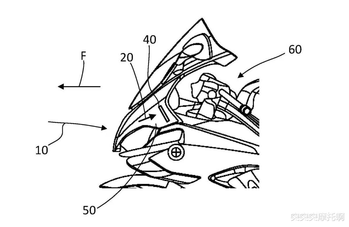 在这一次递交的专利中,宝马设计师将S 1000 RR上的定风翼再度升级。从专利中我们可以看到,新款定风翼并没有改变现有的造型,而是在灯眉后侧加入了一块可以翻折的定风翼。根据小定风翼的位置小编判断似乎是给手把处来导流的,从而减小高速骑行时手把部位的撞风,也可以想象宝马对降低风阻系数的执念。