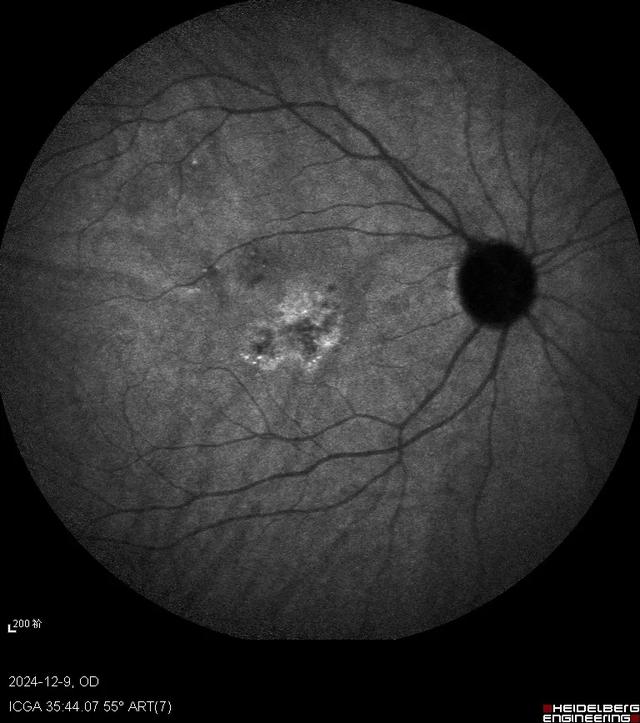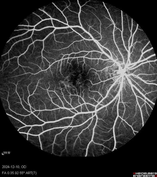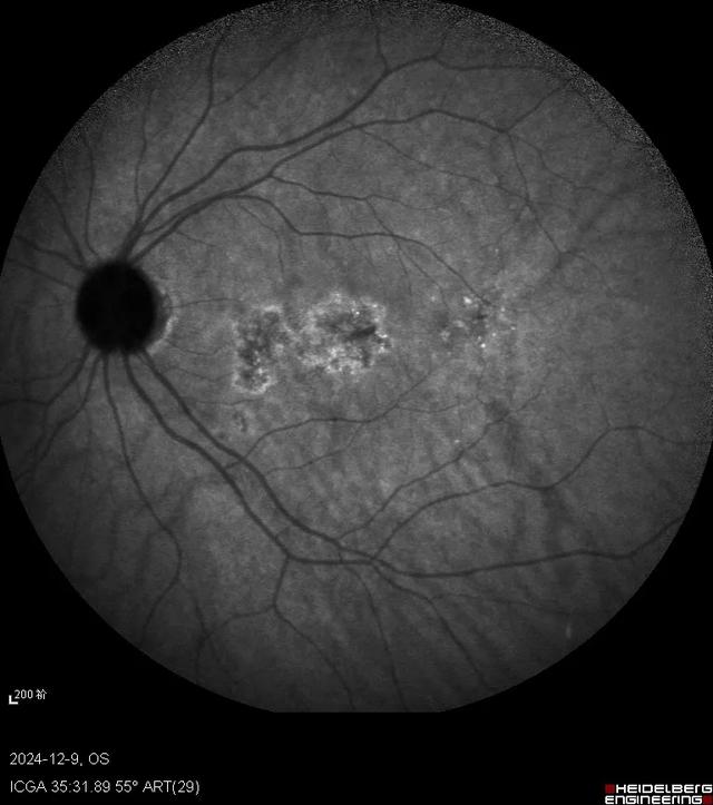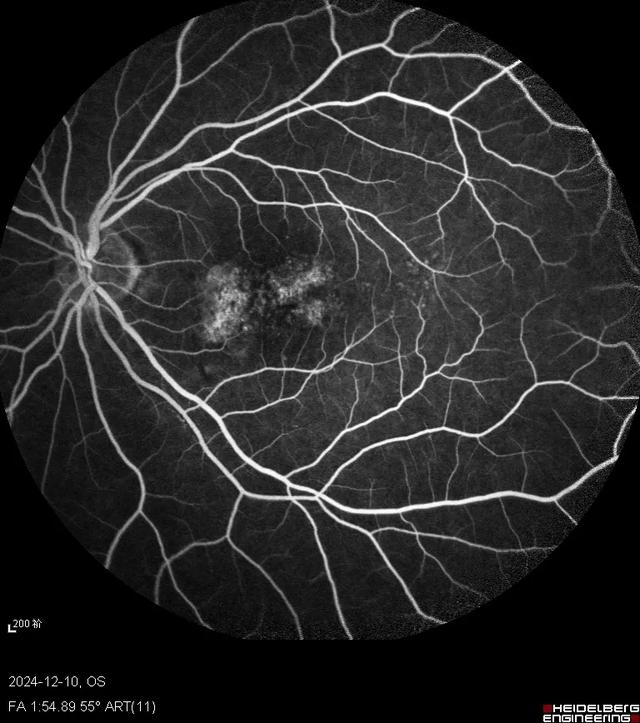 马上对此患者进行了抽血检查来判断是否存在梅毒感染,另外还安排了眼底荧光素血管造影(FFA)和吲哚菁绿(ICG)造影检查。因为我们知道梅毒是“模仿大师”,可以引起视神经炎、视网膜血管炎、脉络膜炎等多种眼底改变。很快造影结果就出来了,右眼FFA黄斑早期高荧光,晚期高荧光衰减;而ICG则早期低荧光,晚期高荧光;左眼FFA黄斑渗漏较右眼明显,ICG晚期也是表现为高荧光。双眼自发荧光类似,表现为中央低荧光,围绕一圈周围高荧光。果不其然,符合这时候梅毒性后极部鳞状脉络膜视网膜炎的临床表现。