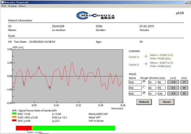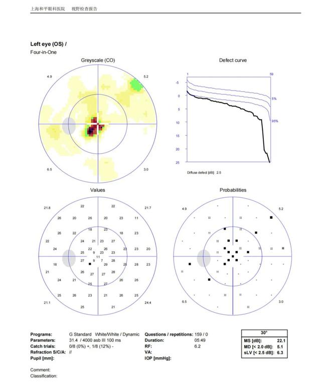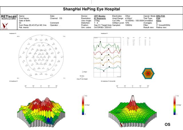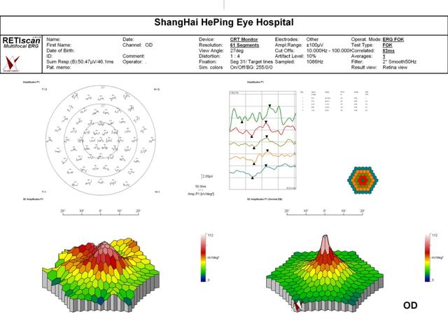 难道是球后视神经炎?但对于球后视神经炎而言,患者年龄偏大,视力及视野损伤也远较球后视神经炎来的轻,所以我认为不是。视网膜电图(ERG)也证实了我的想法,P50及N95波峰并未明显下降,提示整体视网膜及视神经功能还是可以的。mf-ERG提示双眼黄斑中央振幅明显下降,所以还是黄斑问题导致的视力下降。