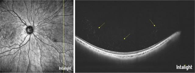 关于梅毒性后极部鳞状脉络膜视网膜炎,《中华眼科杂志》有一篇彭晓燕教授的文章,总结的很好,我引用一下1。彭老师的这组患者共10人,其中8人为双眼发病。视力介于指数~0.8,中位数0.3。仅1例患者出现前房炎症反应。眼底病变均集中在以黄斑为中心的后极部。6只眼表现为鳞样病灶,4只眼表现为弥漫黄白色病灶,其余是混合型。OCT提示主要累及外层视网膜,显著特征是椭圆体层部分或全部消失,RPE结节,玻璃体内细胞。自发荧光表现为斑片状或弥漫高荧光。FFA静脉后期开始轻度高荧光,晚期渗漏。ICGA中晚期低荧光,夹杂针尖状高荧光点。在文献的引导下,我重新回顾了一下OCT,当我把扫描线拉到黄斑区外时,确实发现了很多玻璃体细胞,所以看OCT时还需要更仔细一些。