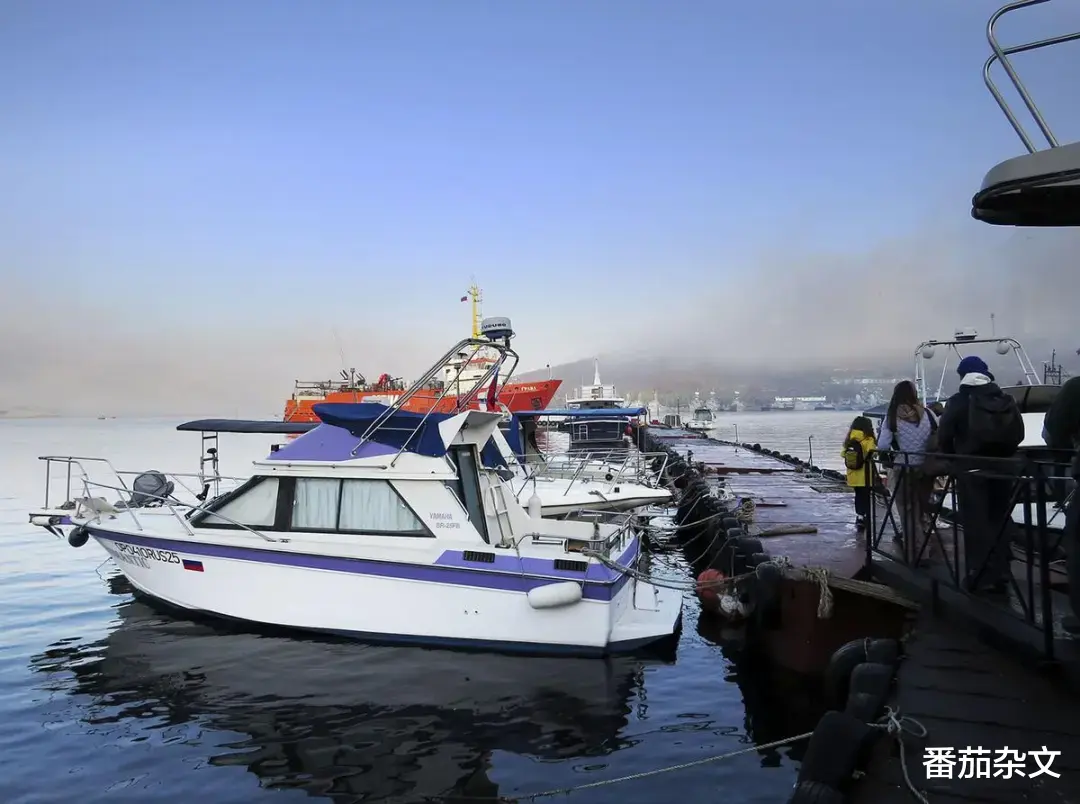 价格大致相同——每人平均5000卢布。早晨,作者与朋友在乌利西斯湾(音译)的码头等候,那里远离黄金角,位于楚尔金区。一共聚集了15人,其中三分之一是莫斯科人,两位是来自哈巴罗夫斯克的夫妇(他们自己经营一家河流旅游公司),其余的是当地人。作者坐在小舱里或宽敞的船尾下,盖上船罩,船舶启动后引擎轰鸣,迅速驶入雾中: