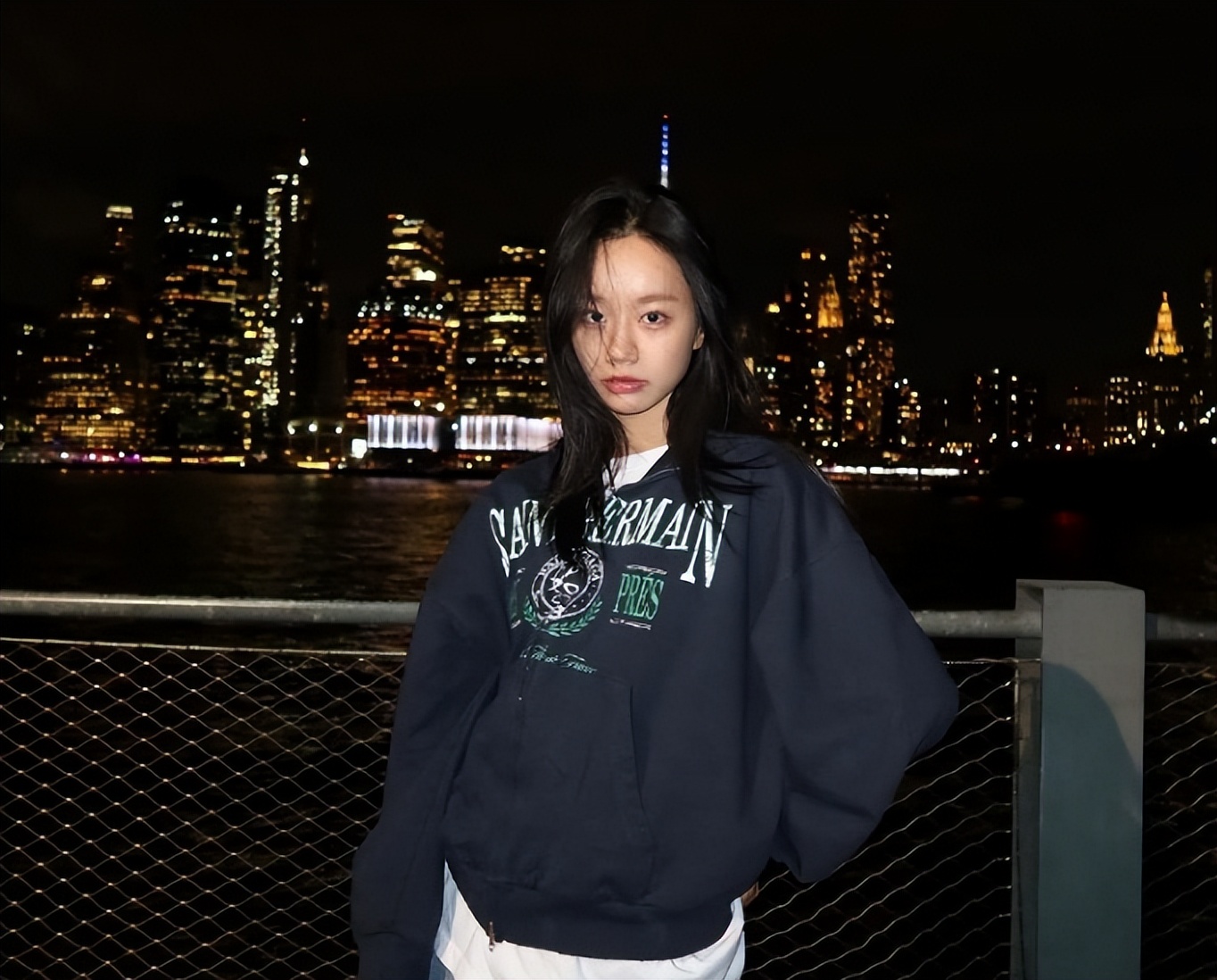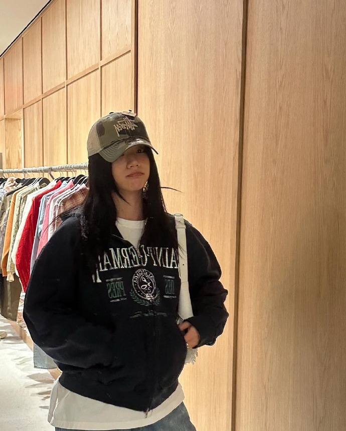 李惠利身穿的蓝色字母印花拉链连帽卫衣,无疑是这身穿搭的亮点所在。蓝色,这种清新而宁静的颜色,自带一种青春的气息,仿佛让人瞬间回到了校园时光。字母印花的加入,为卫衣增添了一份个性与时尚感,打破了纯色卫衣的单调,使其更具视觉冲击力。拉链的设计不仅增加了穿搭的实用性,还赋予了整体造型更多的层次感。连帽的设计则增添了一份休闲与随性,让李惠利看起来更加亲切可爱。