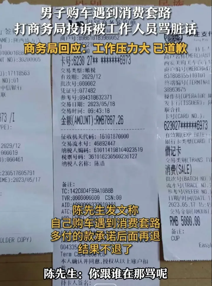 事情是发生在2023年5月份的时候,陕西的陈先生在某汽车销售公司买了一辆小汽车,本来说好落地价是9.7万,可是对方表示,让他多刷一笔,然后信誓旦旦表示回把多刷的钱还给他的。