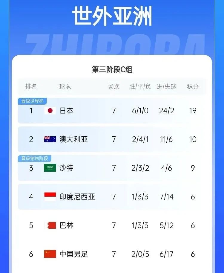 世预赛亚洲区18强赛,国足客场0-1负于沙特,仍居C组积分榜垫底,全场国足控球率只有20%,射门数为可怜的2-20,甚至没一脚射正。考虑到国足下轮在澳大利亚身上拿分的机会不大,因此国足已争二无望,争小组第四才是首要任务。