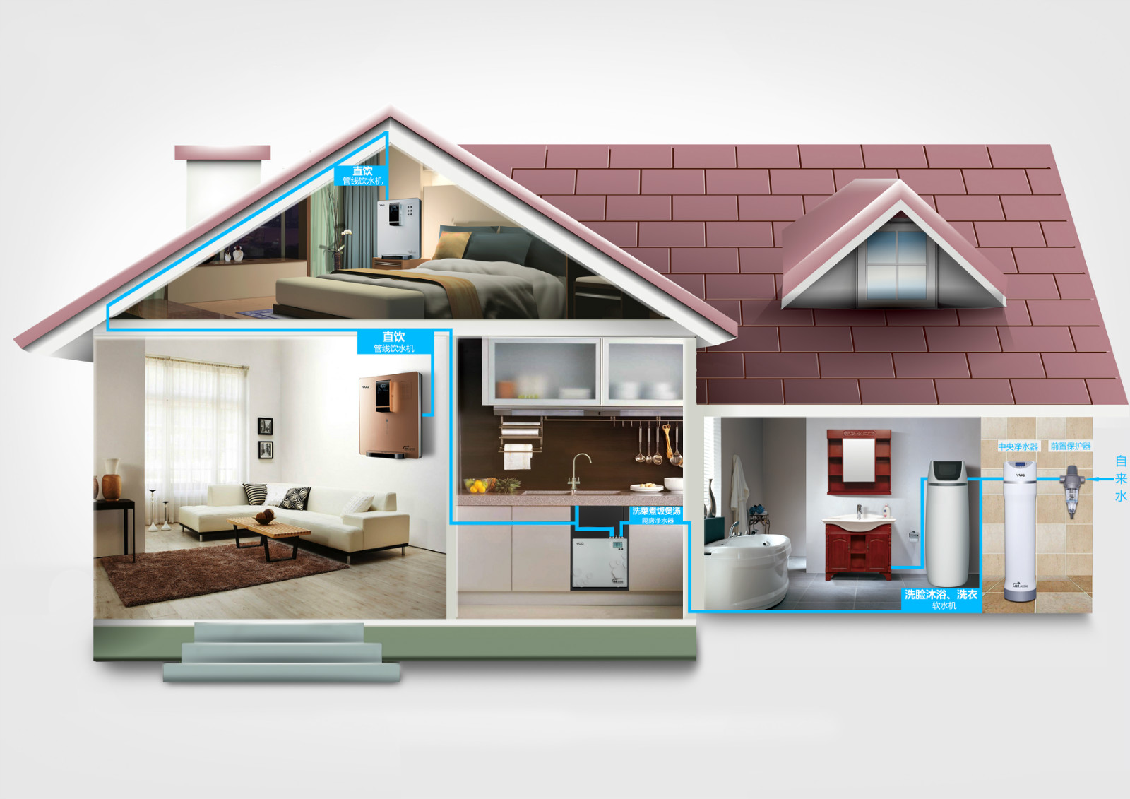 如果单一一款净水设别无法满足对饮水生活的追求,也可以尝试体验全屋净水系统——基本可以兼顾日常生活中的各类用水,包含直饮水、洗涤水、沐浴水等。