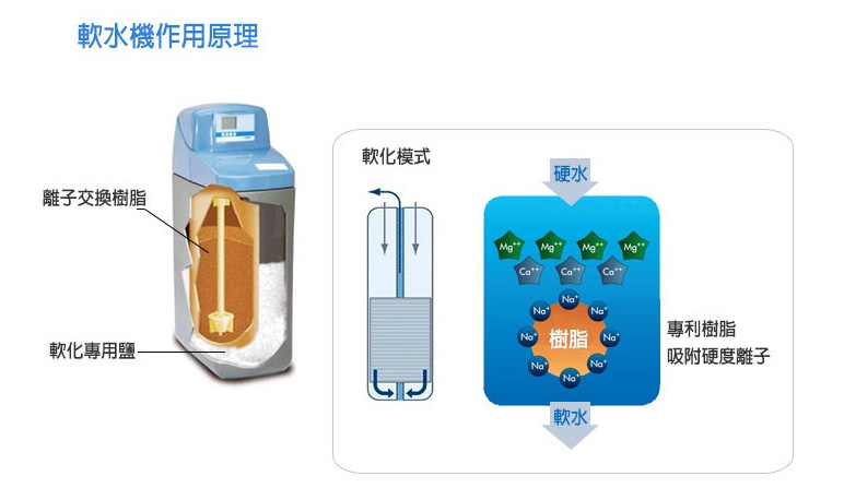 软水机的工作原理是通过离子交换树脂去除水中的钙、镁离子,降低水质硬度;或者通过高能聚合球将水中的钙镁离子打包成结晶体存在于水中,使其在水中不结垢。