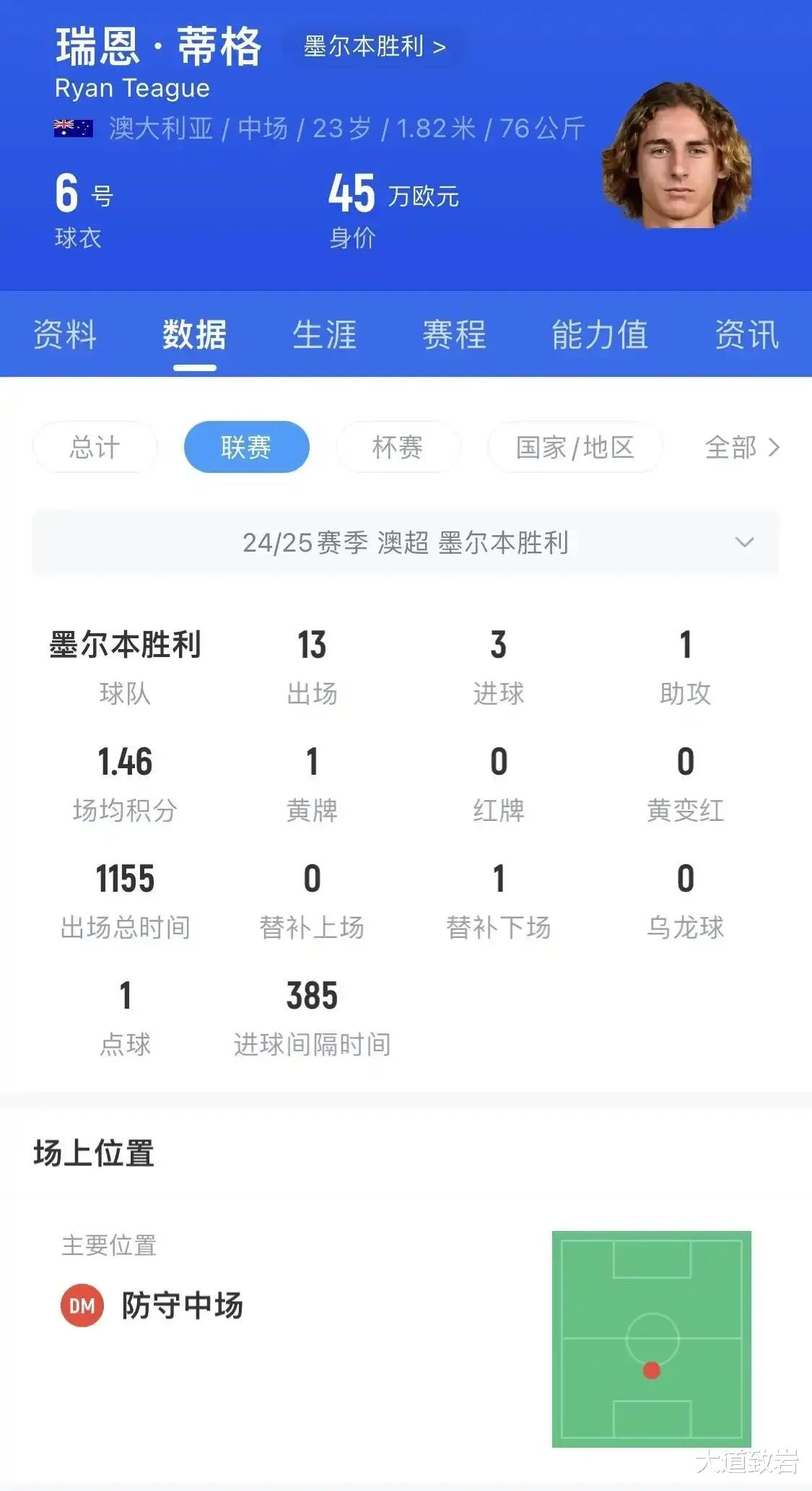 据了解,瑞恩-蒂格出生于2002年,身高1.82米,是一名技术全面的中场球员。他出自悉尼FC青训营,2019年,他作为澳大利亚U17队长,带领球队出征巴西U17世界杯,虽然未能取得理想成绩,但他的个人表现引起了欧洲俱乐部的关注。2020年1月后,蒂格签约葡超法马利康队,此后,又被租借至葡甲科维良体育,2023年回归澳大利亚,加盟墨尔本胜利。