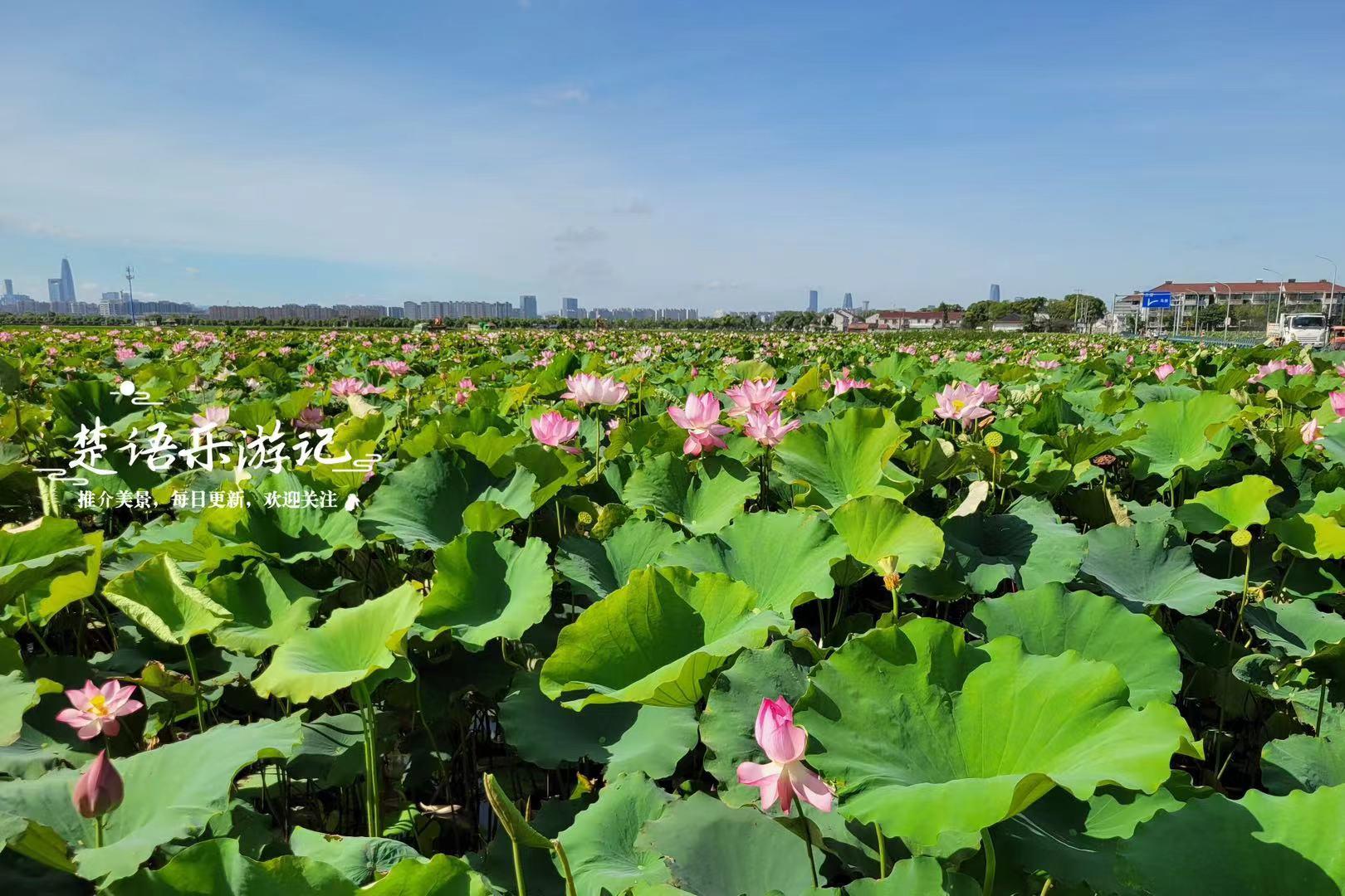 这片荷花田的东西跨度与南北跨度差不多都是500米,面积达数百亩,可谓是宁波城区周边面积最大的荷花了。所以,站在荷花田周边看,满目的翠色,给人一种“一碧万顷”的感觉。