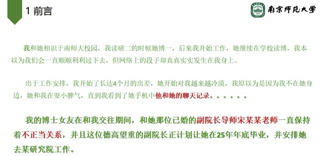 打开PPT之后,就被震惊了,“南京师范大学”“环境学院副院长”“女博士生”“婚内出轨”。