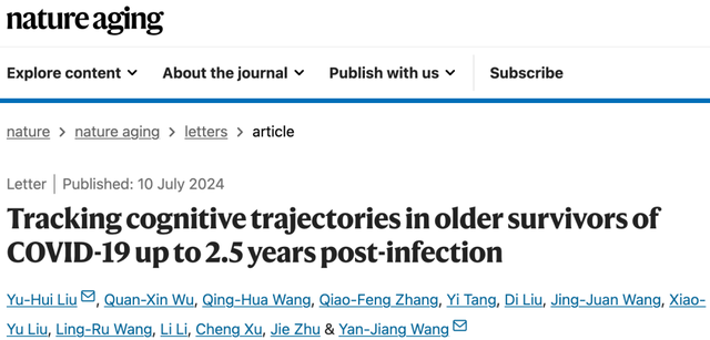 [3] Liu, YH., Wu, QX., Wang, QH. et al. Tracking cognitive trajectories in older survivors of COVID-19 up to 2.5 years post-infection. Nat Aging (2024). doi:10.1038/s43587-024-00667-3