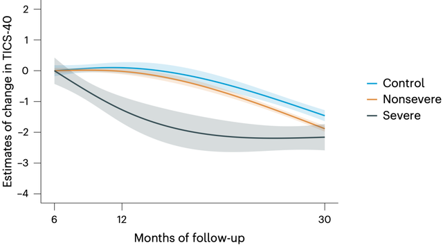 这项随访时间长达30个月的研究,纳入了1245名COVID-19幸存者和358名未受感染的配偶。总体来看,患者出院30个月之后,重症患者的认知功能电话问卷40(TICS-40)得分低于非重症患者和对照组,非重症患者的TICS-40评分低于对照组受试者。