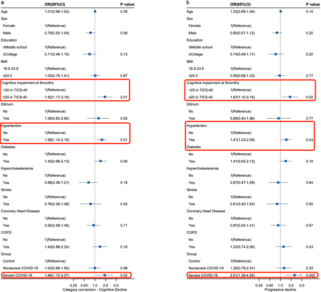 重症COVID-19(OR,2.51;95% CI,1.39-4.55)、6个月时的认知障碍(OR,1.87;95% CI,1.10-3.15)和高血压(OR,1.47;95% CI,1.03-2.09)也与30个月后认知能力逐渐下降的风险更高相关。此外,在对重症患者进行亚组分析之后,他们还发现重症监护与认知能力纵向下降无关。