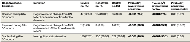 然而,在6个月至30个月的随访期间,他们观察到,与非重症患者(5.29% vs 0.29%,p<0.001)和未感染对照(5.29% vs 0.28%,p<0.001)相比,更多的重症患者在30个月的随访期间认知能力得到改善,即认知状态从疑似MCI或痴呆转为CN,或从疑似痴呆转为MCI。不过,与非重症患者(72.12% vs 89.68%,p<0.001)和未感染对照(72.12% vs 89.94%,p<0.001)相比,重症患者认知状态稳定(即认知状态无转变)的频率较低。