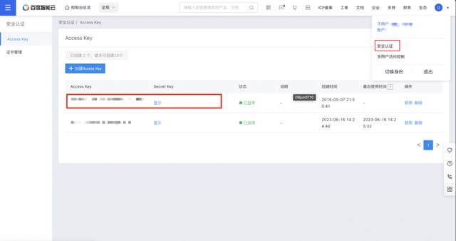 2、右上角个人中心的安全认证里面提取用于鉴权调用 Embedding 模型的 Access Key 和 Secret Key