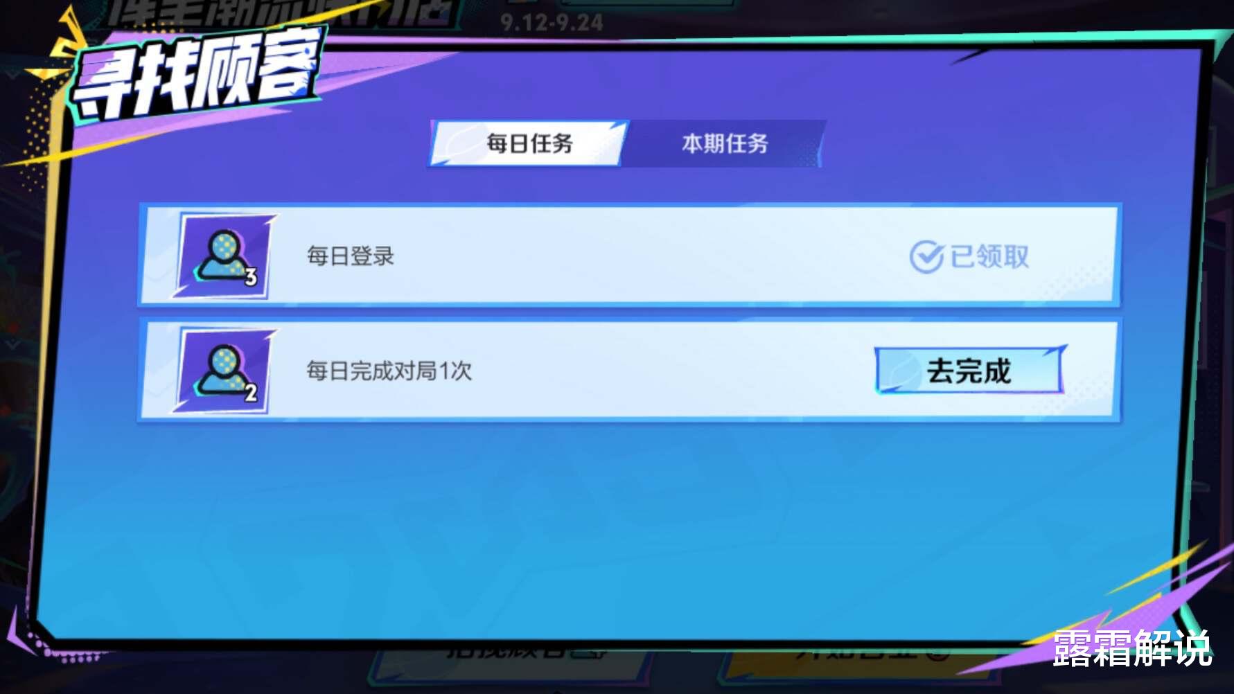 寻找顾客需要通过每日任务和本期任务,每日任务如下图所示,登录游戏可以获得3个顾客,完成一次对局,可以获得2个顾客,一天获得5个顾客。