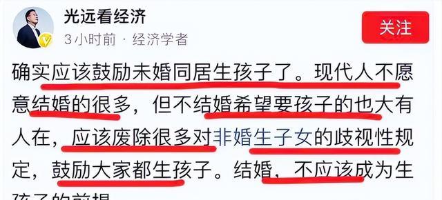 经济学家马光远的建议同样令人吃惊,他认为“为了提高生育率,应该鼓励未婚同居”。