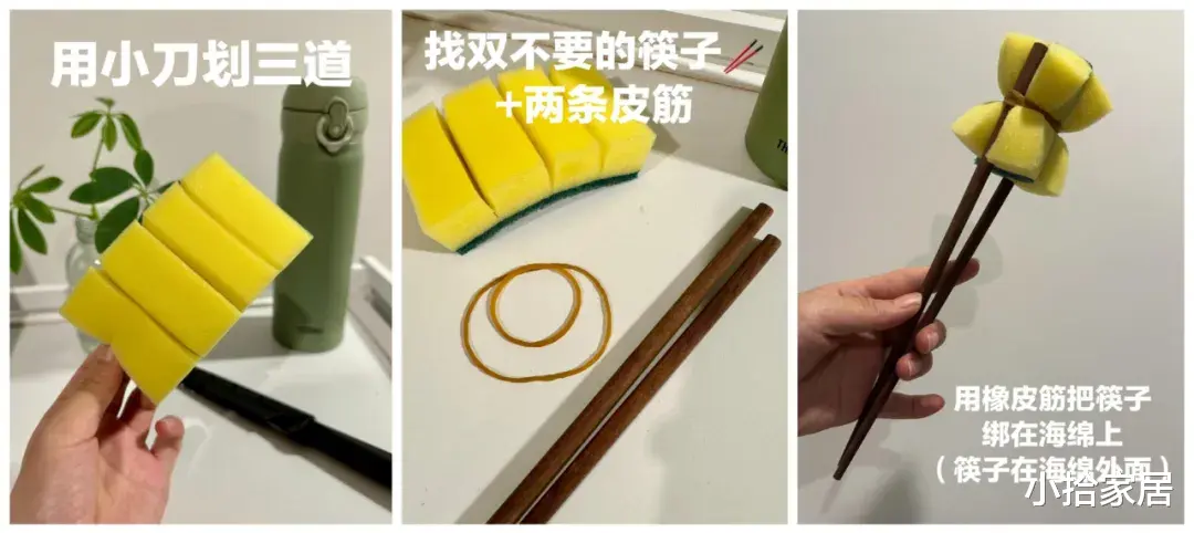 中年阿姨则是用海绵擦自制了一个杯擦工具。方法很简单,就是用刀在海绵擦上划三刀,再找两根皮筋把它绑到不用的筷子上。