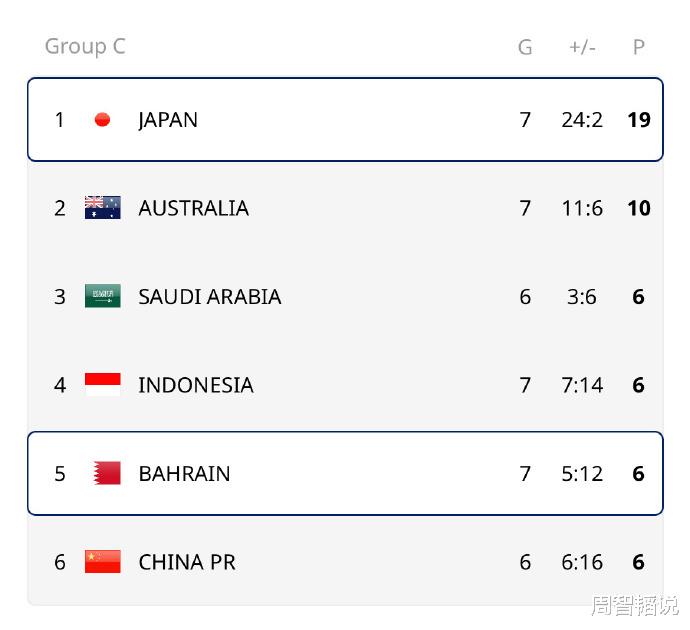 客场负于沙特之后,国足在7轮之后以6分继续在C组垫底,但印尼、巴林同样也只拿到了6分。
