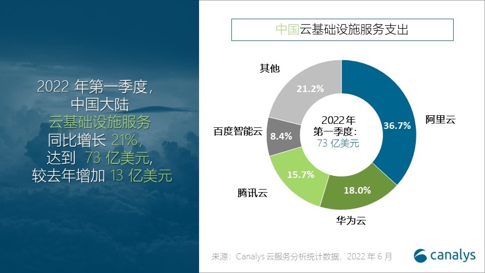 6月8日,调研机构Canalys 发布的2022年第一季度中国云计算市场报告显示:中国云市场整体保持高增长,2022年Q1中国云市场总体规模达到73亿美元,同比增长21%。