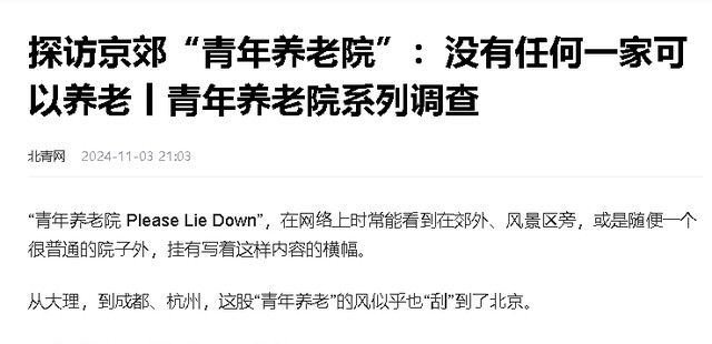 参考资料:北青网——探访京郊“青年养老院”:没有任何一家可以养老丨青年养老院系列调查
