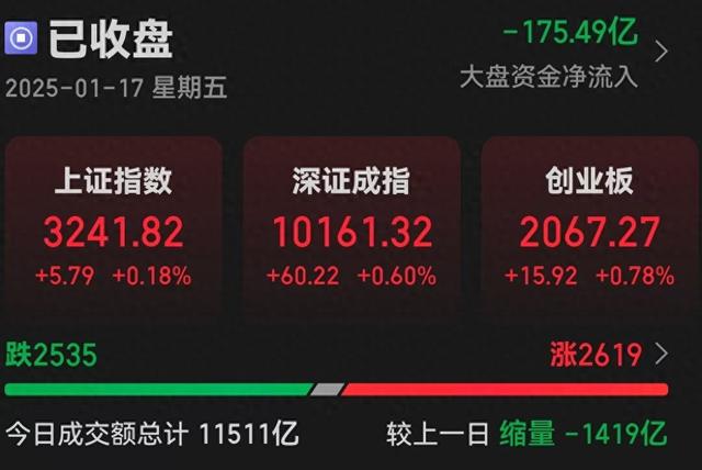 沪深两市上涨2619家,下跌2535家;总成交额约1.15万亿元,较上一交易日缩量1419亿元。