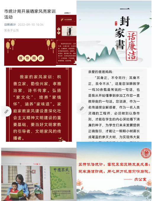 在推进“廉洁文化进机关”上用情。一是用干部职工喜闻乐见的方式,全面激发廉洁文化生机活力。先后策划开展的“晒家风亮家训”“坚守统计初心 打造清廉机关”廉政文化格言征集活动,反映生活、贴近现实,注重接地气、聚人气,深受干部职工欢迎。这些活动在各科室、支部内部形成了“晒比评”良性竞争,营造了你追我赶、争先创优的良好氛围,以丰富的形式全方位、深层次、多维度培育清正廉洁的价值理念。二是充分汲取传统廉洁文化精华,从丰富的中华优秀传统文化中探寻源头活水。重视“修身”教育。选购《中华传统廉政文化十三篇》《年轻干部廉洁教育案例读本》等廉政书籍一批,鼓励统计干部多读书、读好书,从传统文化中涵养克己奉公、清廉自守的精神境界,“不想腐”的治本效能持续放大。三是注重发挥统计女干部在家庭中的“助廉”作用。市统计局女干部在多个科室担任负责人并兼任党支部书记、支委,在统计一线“巾帼不让须眉”,在家庭中更是贤妻良母。通过女干部念好“家字诀”,推动“廉文化”向家庭延伸,相继开展“清廉家书”征集活动,“清风传家座谈会”,精心挑选《严以治家》《清风传家》《中国家风》等经典书目开展亲子阅读活动,积极引导广大统计家庭传家风、重家教、扬正气,共同构筑起反腐防腐、促廉倡廉的坚固家庭防线。总结提炼的《踔厉奋发新征程 日照市统计局:廉洁文化助推事业发展》综合性稿件在“日照清风”微信公众号刊出。