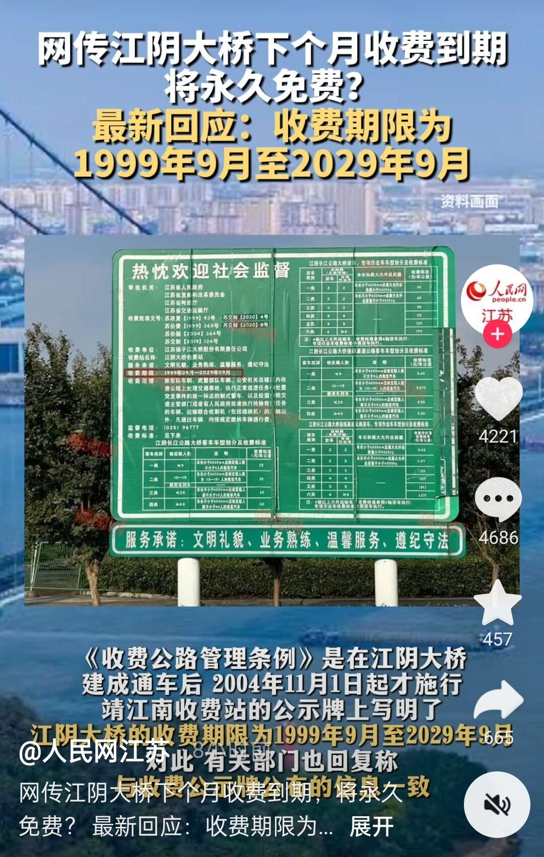 然而理想是美好的,现实却是啪啪打脸的,至少官方没有说江阴大桥要免费。那就看权威媒体的报道,看看人民网江苏的回应,表示相关规定是在江阴大桥建成之后执行的,即2004年11月1日起施行,那用25年的收费期限来看,即需要到2029年11月才算到期,而这推断与靖江南收费站公示牌上写到江阴大桥收费期限是较为一致的,即1999年9月至2029年9月,时间上略有差别,因此媒体表示以这一信息为准。