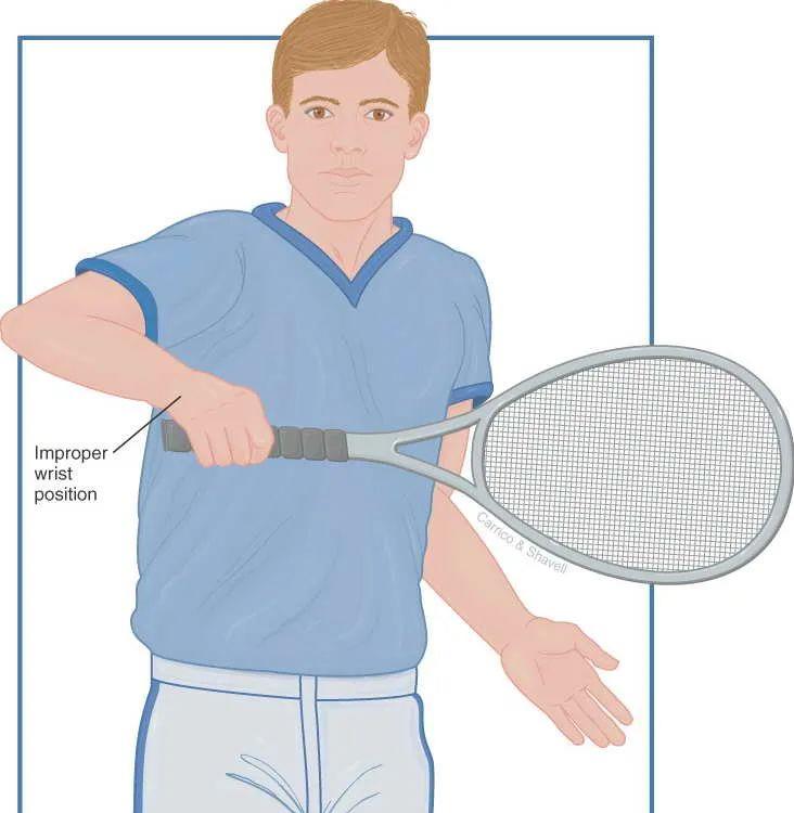 击打网球、乒乓球时技术不正确,网球、乒乓球拍大小不合适,抓握乒乓球拍和网球拍姿势不正确。长期过度运动导致慢性劳损。
