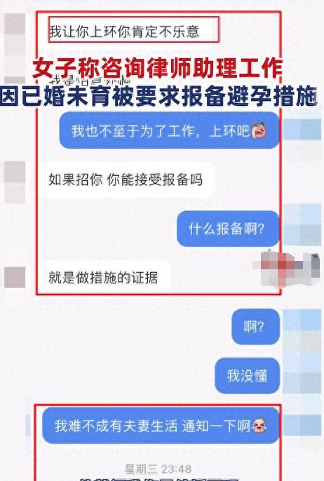 在得知她已婚未育后,这位招聘者竟然要求她每次做完避孕措施后拍照报备,甚至还说出“让你上环你肯定不乐意”这种言语。当时,这位女士觉得许多公司都对已婚未育者有所顾虑,还是选择继续了解。
