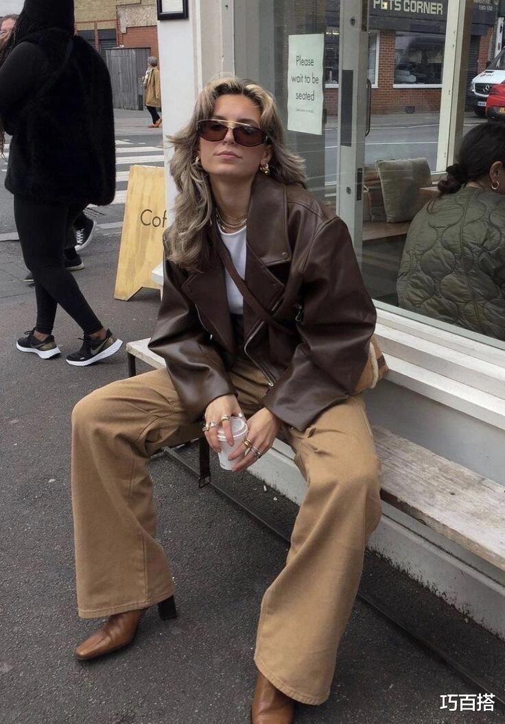 在棕色下装的选择上,大家也可以“各显神通”,棕色下装分为棕色长裤和棕色半裙,选择长裤的姐妹,可以考虑棕色牛仔裤、棕色皮裤和棕色西装裤,棕色工装裤上身复古摩登,洒脱飒爽。