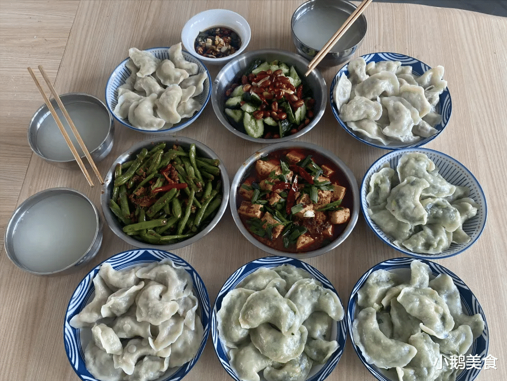 老乡一家都爱吃饺子,尤其他家孩子爱吃韭菜鸡蛋馅的,婆婆一大早就去菜地里割韭菜、芹菜等,自己种的菜又鲜又嫩,绿色纯天然,是买的菜怎么都比不了的。婆媳俩忙活一个多小时才包好,有芹菜猪肉的,还有韭菜鸡蛋的。大家都夸这饺子,不管是皮还是馅,都比买的好吃,吃着饺子喝着饺子汤,可美了,就像过年回到家了一样。