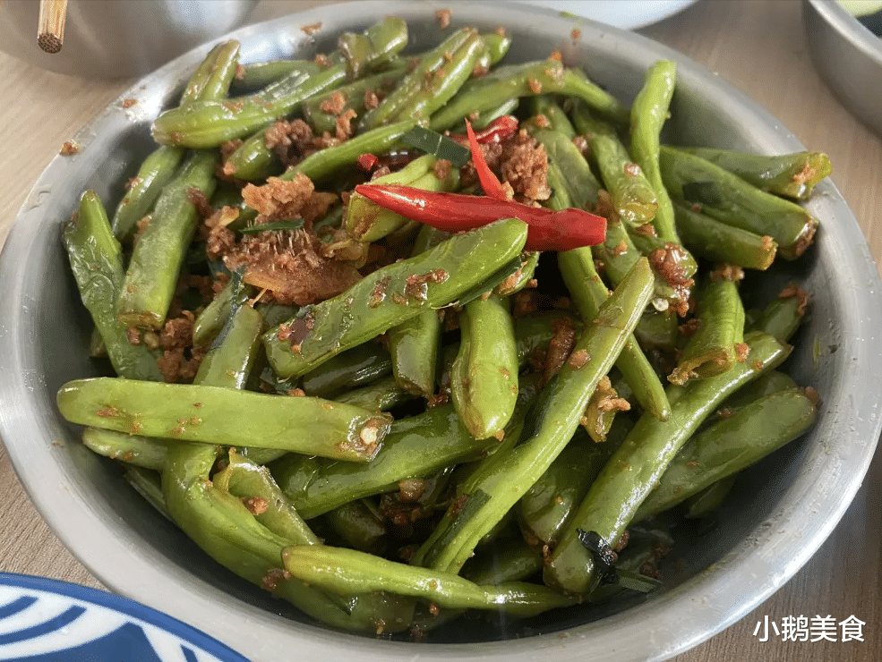 这盘是肉末四季豆,我家孩子和老乡家的孩子,都特别爱吃四季豆,这菜只要聚会也是必须安排的,这盘吃完又添了一盘,最后也吃得没剩几根了。