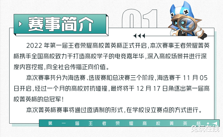 11月5日,2022年第一届《王者荣耀高校菁英杯》将正式开启。本次《王者荣耀高校菁英杯》携手全国高校致力于打造高校学子的电竞嘉年华,展现高校学子的电竞高光和生活热情。