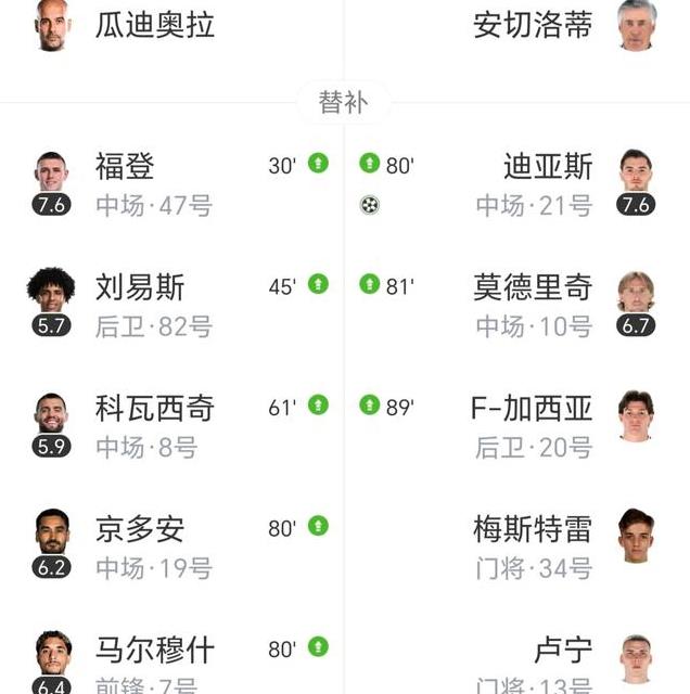 安切洛蒂换人后没几个分钟,瓜迪奥拉就用京多安、马尔穆什换下了德布劳内、萨维尼奥。这下安切洛蒂意识到也该变了,他用迪亚斯换下了罗德里戈。仅两分钟后,迪亚斯就用扳平进球回报了安切洛蒂的信任。